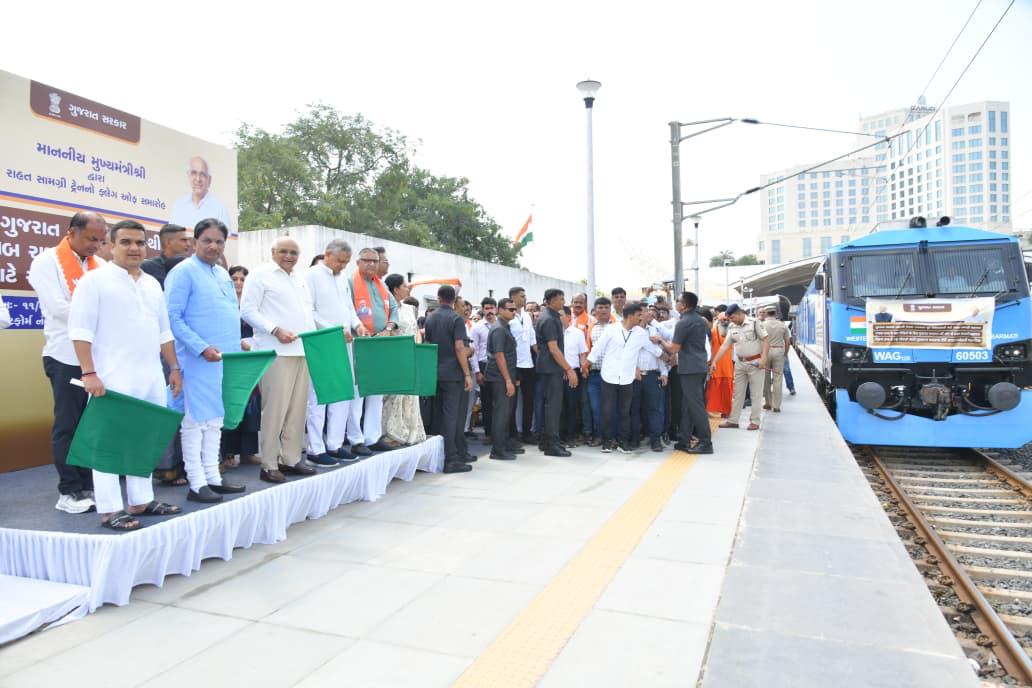 मुख्यमंत्री ने बताया कि गुजरात सरकार ने पहले ही पंजाब और छत्तीसगढ़ के बाढ़ प्रभावितों की सहायता के लिए 5-5 करोड़ रुपये की सहायता राशि दोनों राज्यों के मुख्यमंत्रियों को भेज दी है। इस मौके पर प्रवक्ता मंत्री ऋषिकेश पटेल ने जानकारी दी कि राहत ट्रेन में कुल 22 डिब्बे लगे हैं और इसमें गेहूँ से लेकर कपड़ों तक की सामग्री भेजी गई है। वहीं छत्तीसगढ़ के प्रभावित इलाकों के लिए भी करीब 8 हजार राहत किट तैयार कर भेजी गई है।