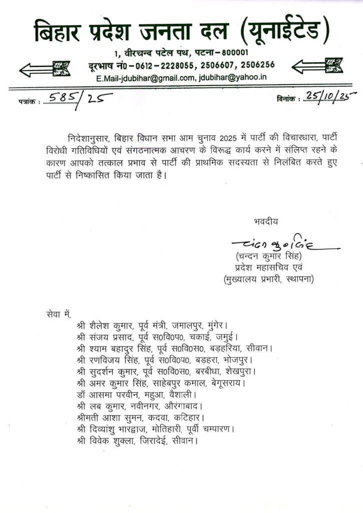जदयू अनुशासनात्मक कार्रवाई जदयू निष्कासन पार्टी विरोधी गतिविधि बिहार विधानसभा चुनाव शैलेश कुमार जदयू