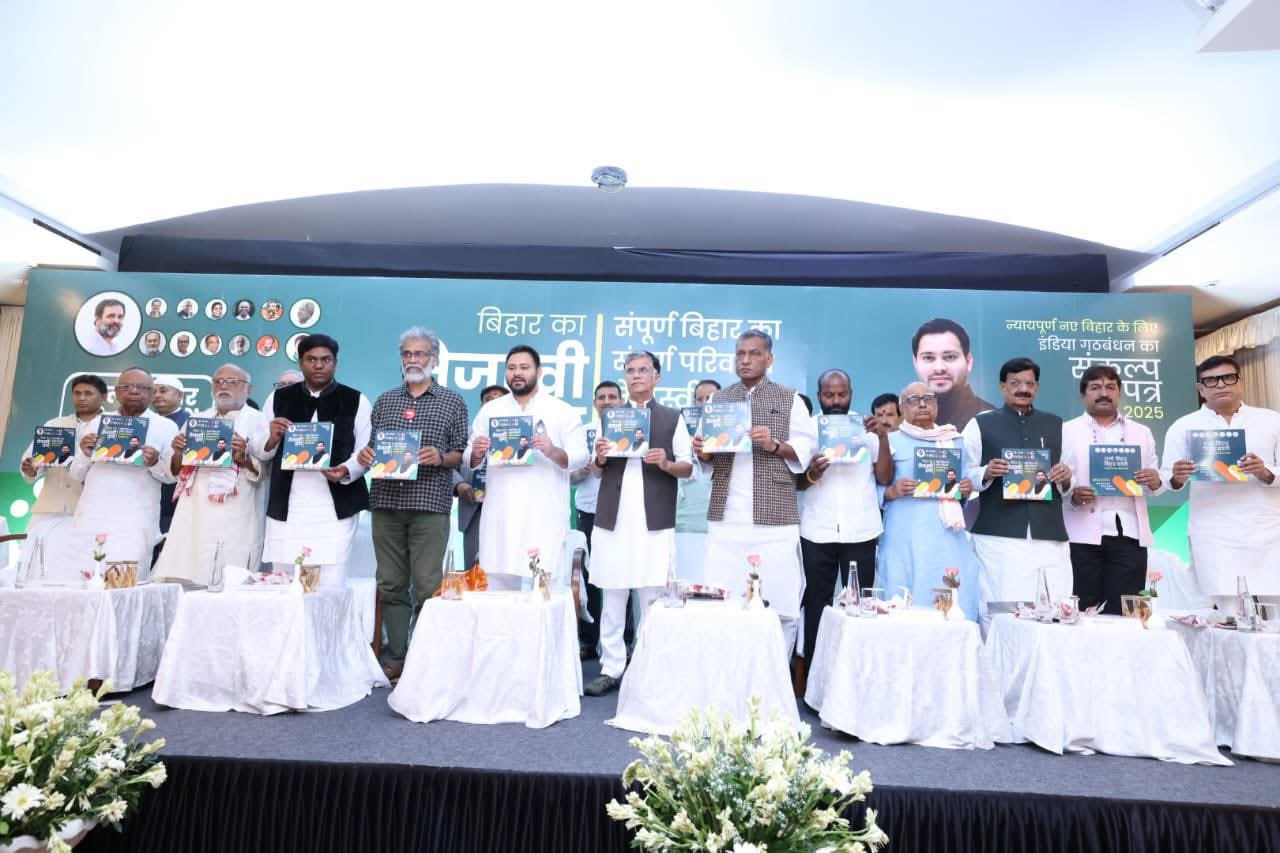Patna News:- बिहार विधानसभा चुनाव 2025 को लेकर महागठबंधन ने शनिवार को अपना घोषणापत्र ‘बिहार का तेजस्वी प्रण’ जारी किया। पटना में आयोजित कार्यक्रम में सीएम उम्मीदवार तेजस्वी यादव, प्रदेश कांग्रेस अध्यक्ष अखिलेश प्रसाद सिंह, सीपीआई(एमएल), सीपीआई और सीपीएम के वरिष्ठ नेता मंच पर मौजूद रहे। घोषणापत्र में महागठबंधन ने रोजगार, बिजली, पेंशन और महिला सशक्तिकरण से जुड़े कई बड़े वादे किए हैं।