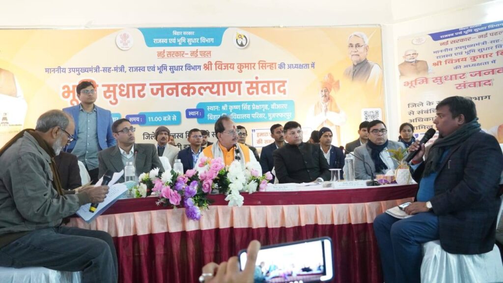 राजस्व एवं भूमि सुधार विभाग की ओर से “नई सरकार, नई पहल” कार्यक्रम के तहत बिहार विश्वविद्यालय स्थित श्रीकृष्ण सिंह सभागार में इस जनसंवाद का आयोजन किया गया। कार्यक्रम की अध्यक्षता स्वयं उप मुख्यमंत्री विजय कुमार सिन्हा ने की। इस दौरान मुजफ्फरपुर जिले के 16 प्रखंडों से भूमि से संबंधित हजारों आवेदन प्राप्त हुए, जिनमें कई मामलों की सुनवाई मंत्री ने खुद की।