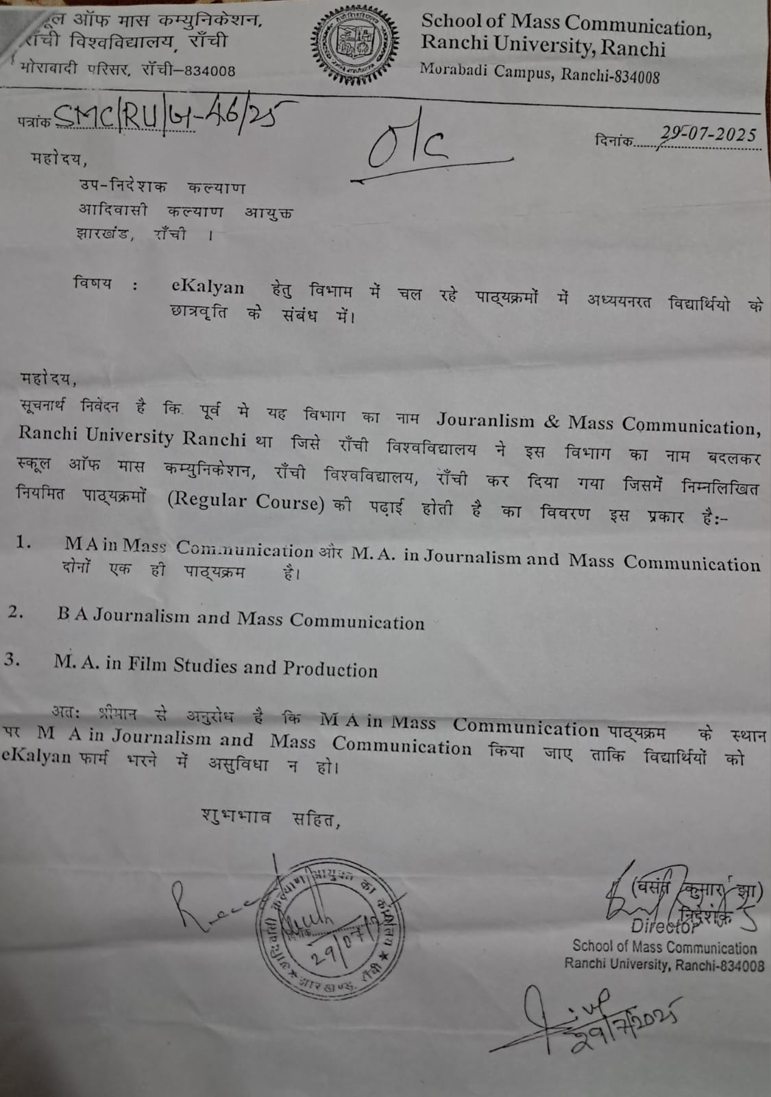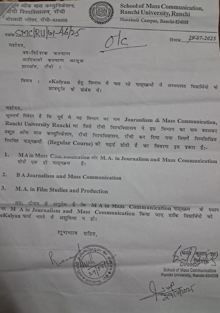 Ranchi News:- रांची विश्वविद्यालय के स्कूल ऑफ मास कम्युनिकेशन की लापरवाही से दर्जनों छात्र-छात्राओं का भविष्य अधर में लटक गया है। विभाग की एक प्रशासनिक गलती के कारण कई विद्यार्थियों को अब तक छात्रवृत्ति की राशि नहीं मिल पाई है।