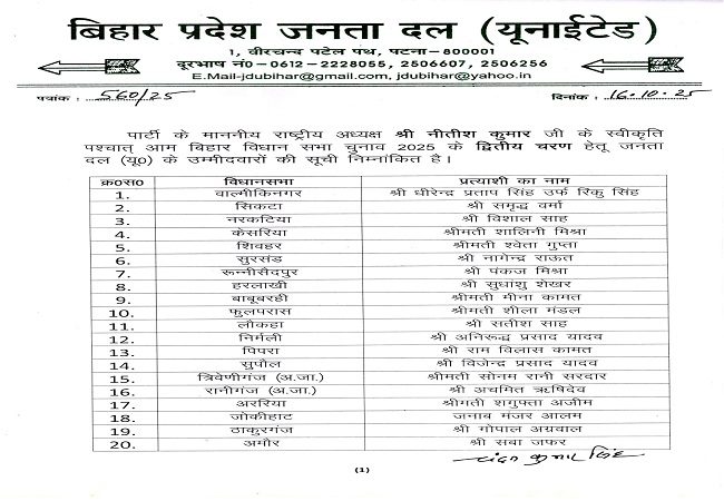 जदयू नेताओं का कहना है कि यह सूची विकास, सामाजिक संतुलन और जन प्रतिनिधित्व को ध्यान में रखकर तैयार की गई है। पार्टी अब पूरे जोश के साथ चुनाव प्रचार की तैयारी में जुट गई है।