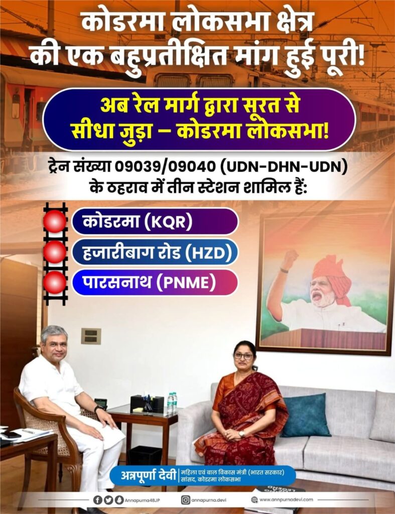 नई व्यवस्था: पहले यह ट्रेन गया तक सीमित थी, अब इसे धनबाद तक बढ़ाया गया है, जिससे झारखंड के कई ज़िलों को लाभ मिलेगा। यह ट्रेन सूरत और झारखंड के बीच काम करने वाले श्रमिकों, व्यापारियों, छात्रों और आम नागरिकों के लिए बड़ी राहत लेकर आई है। इससे न केवल यात्रा सुलभ होगी, बल्कि सामाजिक और आर्थिक गतिविधियों को भी गति मिलेगी। यह रेल विस्तार केवल परिवहन की सुविधा नहीं, बल्कि कोडरमा लोकसभा क्षेत्र के विकास की दिशा में एक मील का पत्थर है। केंद्रीय मंत्री अन्नपूर्णा देवी की जनप्रतिबद्धता और प्रयासों से यह सपना साकार हो सका है, जिससे हजारों परिवारों को अब यात्रा में सहूलियत मिलेगी।