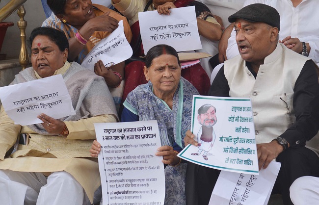 Patna News: बिहार विधानमंडल के दोनों सदनों में आज विपक्षी सदस्यों ने राष्ट्रगान के अपमान के मुद्दे पर मुख्मंत्री को घेरा। इस पूरे प्रकरण के बीच विरोधी दल की नेता राबड़ी देवी ने नीतीश कुमार को कानून समझाया है और उनके लिए तीन साल की सजा की मांग कर दी है। इसको लेकर दोनों ही सदनों में विपक्षी दल हमलावर हो गए । हंगामे के कारण विधानसभा और विधान परिषद की कार्यवाही नहीं चल सकी।
