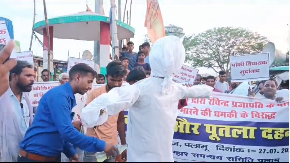 Palamu: जिला कुम्भकार संघ की ओर से शनिवार को प्रतिवाद मार्च निकालकर लेस्लीगंज के गांधी चौक में पांकी विधायक कुशवाहा डॉ शशिभूषण मेहता का पुतला दहन किया गया। मौके पर आक्रोशित लोगों ने शशिभूषण मुर्दाबाद, विधायक मुर्दाबाद के नारे भी लगा रहे थे। यह कार्यक्रम रवींद्र प्रजापति एवम उनके घर मे घुसकर महिलाओं के साथ अभद्र व्यवहार एवम मारपीट करने के विरोध में किया गया।