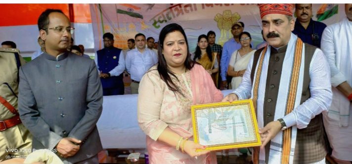 Nawada News:- स्वतंत्रता दिवस के अवसर पर नवादा के हरिश्चंद्र स्टेडियम में आयोजित समारोह में जीएसटी जमा करने में जिले में प्रथम स्थान पाने वाली अंजलि इंटरप्राइजेज की मालकिन रेशमा सिन्हा को बिहार सरकार के मंत्री जीवेश मिश्रा ने सम्मानित किया।