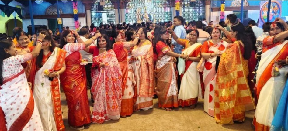 दुर्गा प्रतिमा के विसर्जन से पूर्व हुए इस आयोजन ने पूरे माहौल को श्रद्धा और उत्सव की भावना से भर दिया। महिलाएं एक-दूसरे को गले लगाकर अगले वर्ष फिर से मां दुर्गा के स्वागत का वादा करती रहीं।