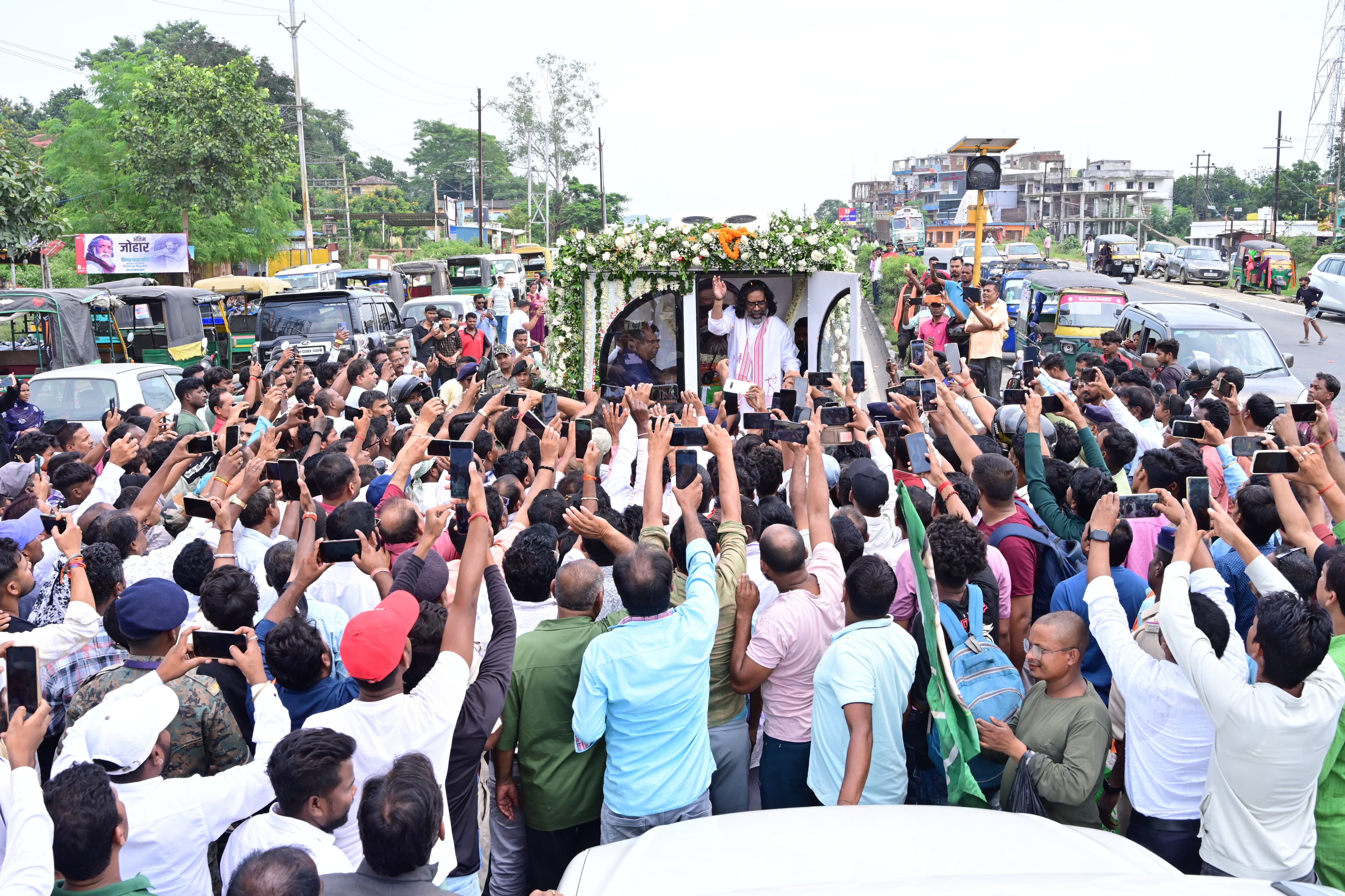 गुरुजी की अंतिम यात्रा के दौरान रामगढ़ जिले के गोला, ओरमांझी, सिकिदिरी और अन्य स्थानों पर बड़ी संख्या में लोग सड़कों के किनारे खड़े होकर उन्हें अंतिम नमन करते दिखे। हर मोड़ पर गुरुजी के समर्थन में नारे गूंजते रहे और लोग ‘दिशोम गुरु अमर रहें’ का उद्घोष करते रहे।